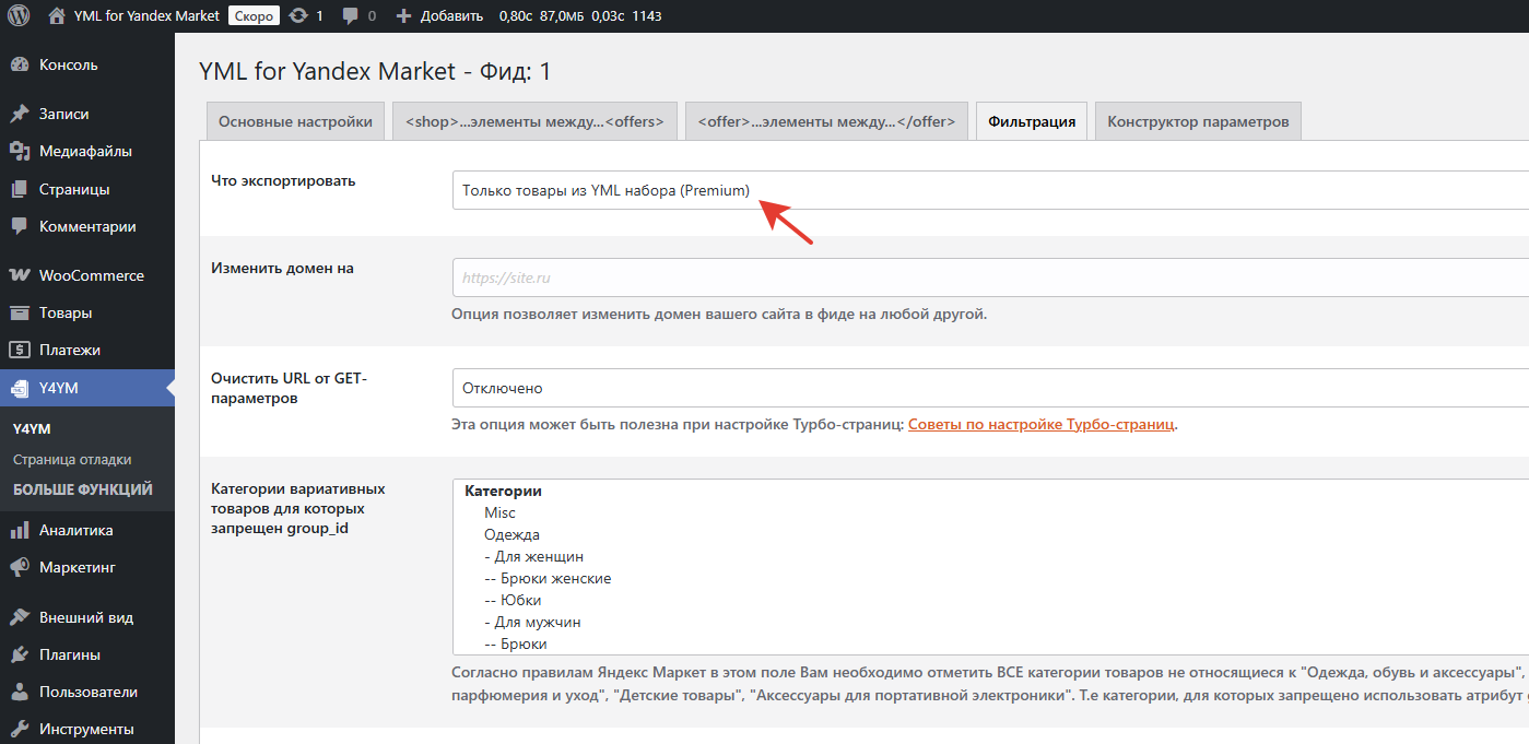 После этого необходимо перейти в настройки фида и напротив пункта "Что экспортировать" выставить значение "Только товары из YML набора (Premium)". Далее сохраните настройки и запустите обновление фида. После генерации в нём останутся только товары у которых проставлена галочка "Добавить в YML набор".