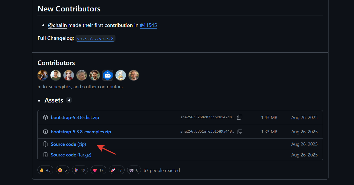 На первом шаге необходимо скачать исходные коды нужной версии Bootstrap можно очень просто, например с GitHub. Для этого заходим в раздел "Releases" этого проекта, выбираем необходимую версию, например, 5.3.8, и нажимаем на ссылку "Source code (zip)".